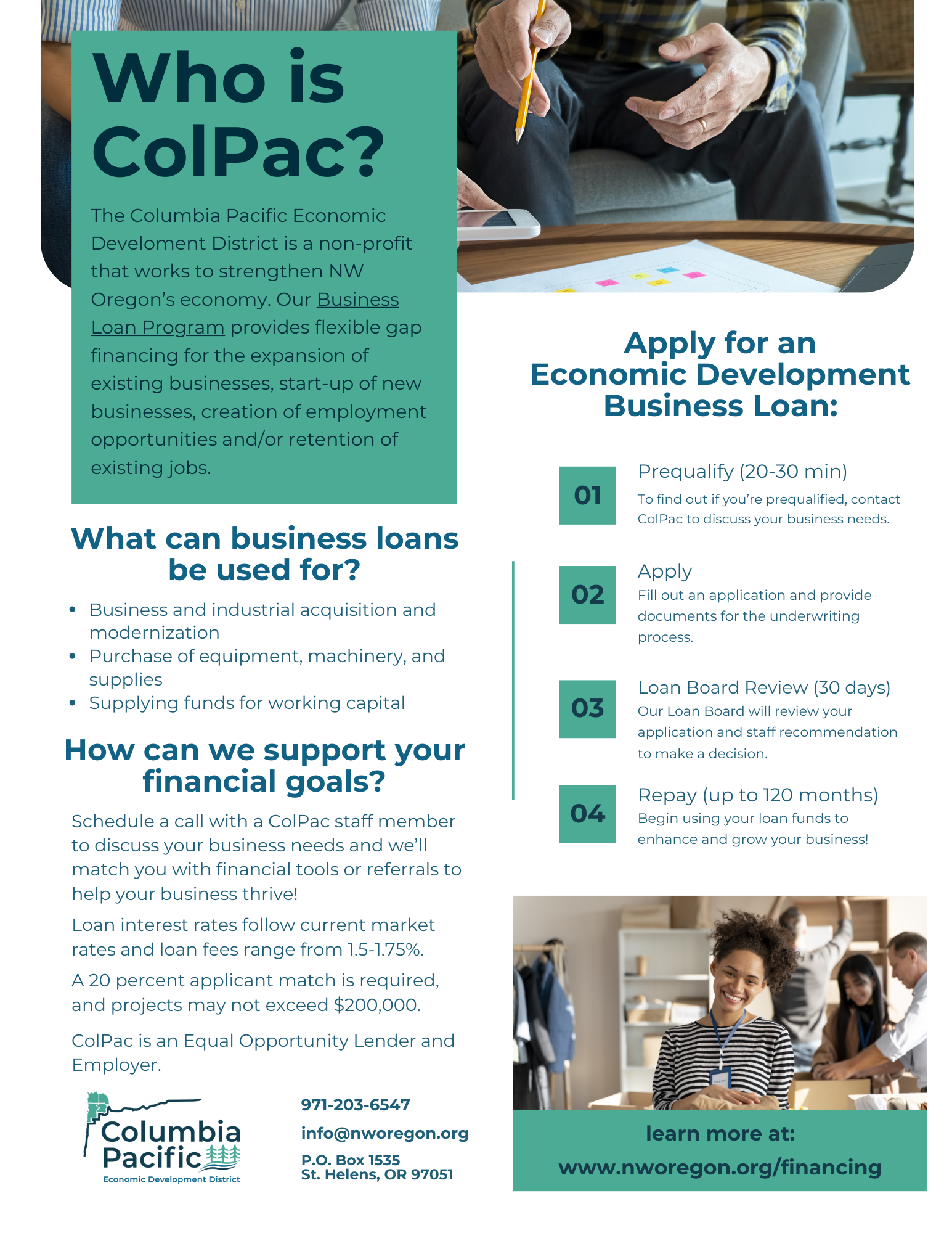 The Columbia Pacific Business Loan Program provides flexible gap financing for expansion of existing businesses, start-up of new businesses, creation of employment opportunities and/or saving existing jobs in NW Oregon.